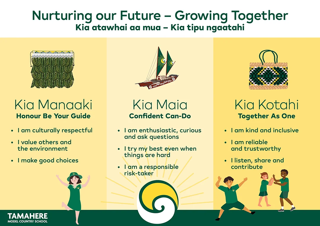 Kia Kotahi – Together as one – working together as a team, a big part of this is how you treat others, showing kindness and consideration and supporting those who need a bit more help.